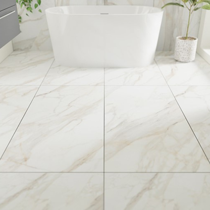 The Calacatta Gold White Porcelain Tile captures the exquisite character of natural marble, featuring soft white tones enhanced by delicate golden and grey veining. Its high-gloss surface beautifully reflects light, creating a bright, spacious, and elegant atmosphere in any interior. The rectified edges allow for tighter grout joints, resulting in a smooth, continuous surface that exudes modern sophistication.